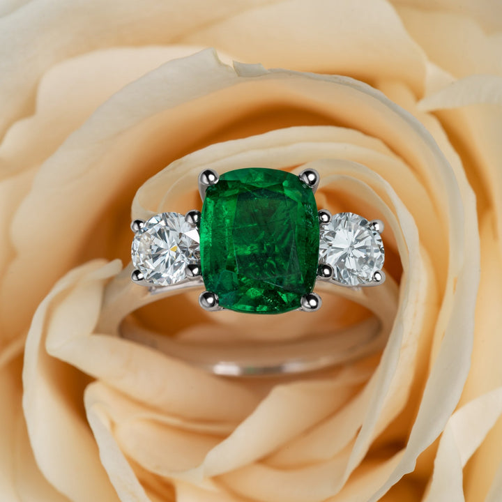Oval Shaped Emerald and pear shaped diamond 3 stone ring