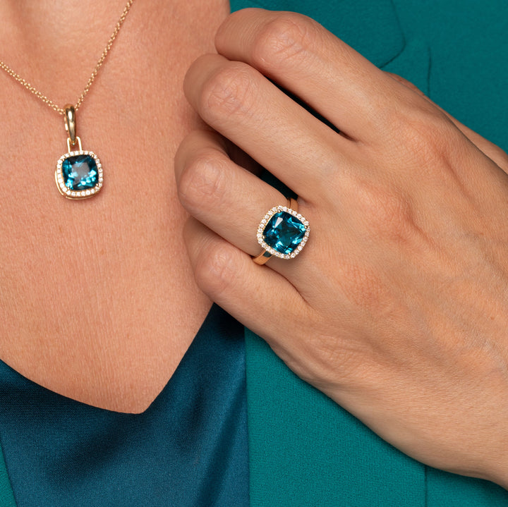 Nova cushion shaped London Blue Topaz ring with a halo of diamonds
