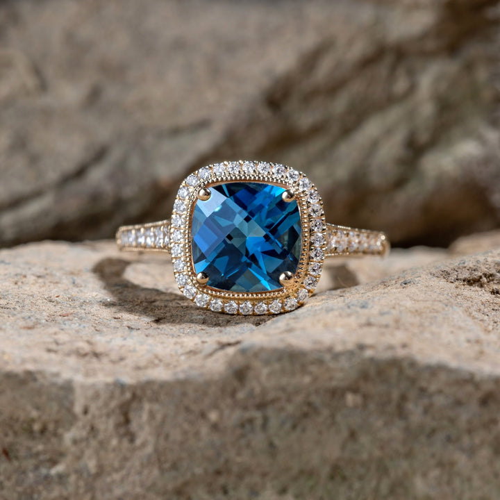 OVAL SHAPED AQUAMARINE AND ROUND BRILLIANT CUT DIAMOND HALO STYLE RING