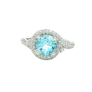 This exquisite aquamarine ring showcases a stunning round aquamarine stone as its centrepiece, elegantly secured in a four-claw platinum setting that ensures both security and minimal visual obstruction. The aquamarine is surrounded by a sophisticated halo of round brilliant-cut diamonds arranged in a fancy cluster design, which amplifies the stone's brilliance and creates a captivating interplay of light. The platinum band provides exceptional durability and a lustrous white finish that complements both the cool tones of the aquamarine and the sparkle of the diamonds.