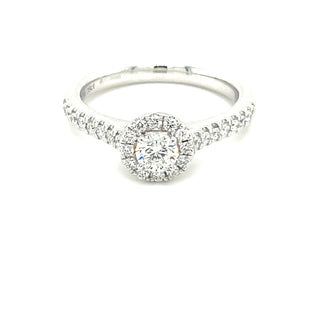 Platinum, Aurora cut diamond set in a 4 claw setting surrounded by a diamond set halo and diamond set shoulders.