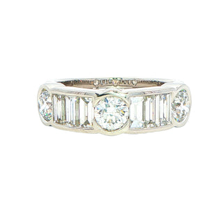 Expertly crafted in platinum, this eternity ring features three brilliant cut diamonds paired with six large baguette cut diamonds, combining to a total weight of 2.01 carats. The design balances the intense sparkle of brilliant cuts with the striking geometric elegance of the baguette stones, creating a sophisticated and lasting symbol of timeless beauty.