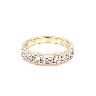 This exquisite eternity ring showcases round brilliant cut diamonds set in lustrous 18 carat yellow gold. The alternating stone sizes create a sophisticated visual rhythm whilst maintaining the classic eternity aesthetic. Each diamond is precisely cut to maximise brilliance and fire, delivering exceptional sparkle from every angle. The warm glow of yellow gold complements the diamonds beautifully, making this piece equally striking as an engagement ring or meaningful anniversary gift. A timeless design that celebrates enduring elegance.
