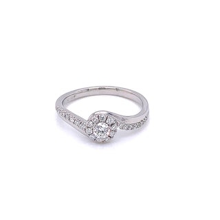 Expertly crafted in platinum, this round brilliant cut diamond ring is the perfect balance of classic and modern. The centre diamond is surrounded by a sparkling halo and set in a unique twist style, creating a stunning and eye-catching piece. Elevate any look with this timeless and elegant ring.