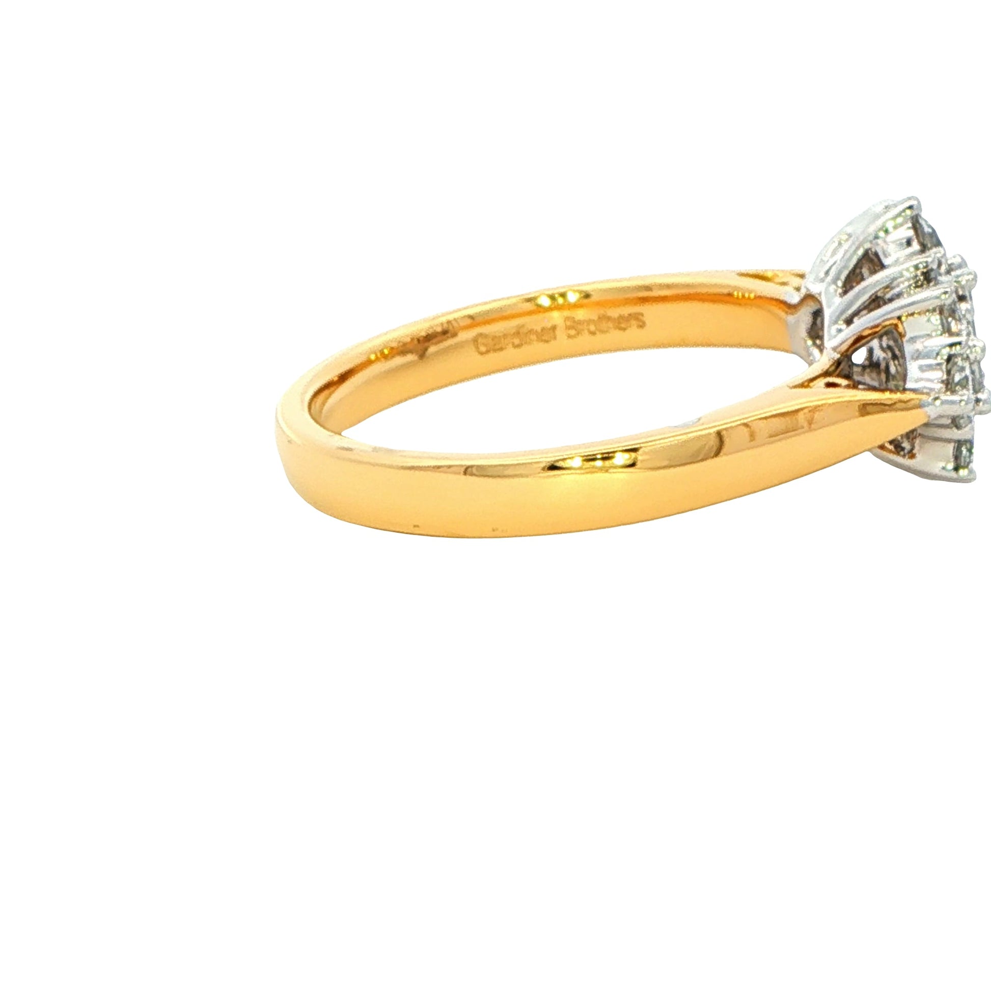 This 18ct yellow gold Emerald and Round Brilliant Cut Diamond Cluster Ring features three emerald cut diamonds set in a Platinum claw setting surrounded by 12 round brilliant cut diamonds. 1.02cts of diamond sparkle and dazzle, making this the perfect statement ring.