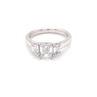This stunning 3 stone ring features a 1.00ct emerald cut diamond set in a 4 claw setting, complemented by step cut trapezoid diamonds on each side. Made of platinum, this ring boasts a total of 1.40cts, making it the perfect choice for those seeking a classic and elegant look. Its design also makes it suitable for wearing with a wedding band.
