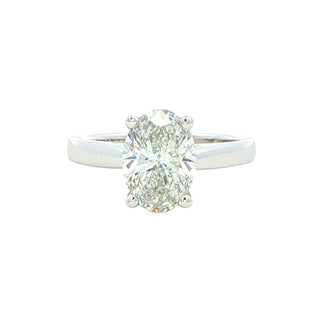 This platinum solitaire ring features a stunning 2.02ct lab grown oval shaped diamond, expertly set in a 4 claw setting. Its sleek design is wedding band friendly, making it the perfect option for a timeless and elegant engagement ring. Trust in the precision and quality of lab grown diamonds.