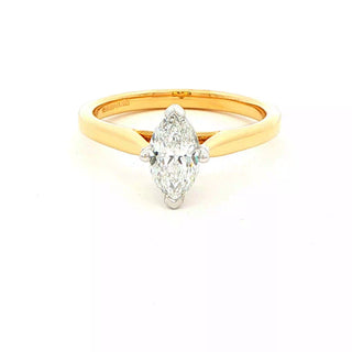 This 0.70ct marquise shaped diamond solitaire ring is set in a 4 claw platinum setting, creating a stunning piece of jewellery. The 18ct yellow gold band adds a touch of elegance. Its design allows for easy pairing with a wedding band, making it a perfect choice for a timeless and beautiful wedding set.