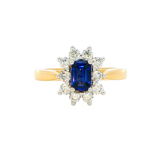 This exquisite cluster ring showcases a striking octagonal sapphire as its centrepiece, elegantly framed by ten round brilliant-cut diamonds in a sophisticated cluster arrangement. The sapphire is mounted in a platinum setting, prized for its durability and neutral lustre that complements the gemstones perfectly. The 18ct yellow gold band provides warmth and classic appeal, creating a striking contrast with the cool platinum surround.