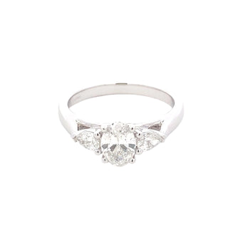 Crafted with platinum, this 3 stone ring showcases a stunning 0.70ct oval shaped diamond in a 4 claw setting, accented by pear shaped diamonds on each side. With a total carat weight of 1.00cts, this ring is perfect for those seeking a wedding band friendly option.