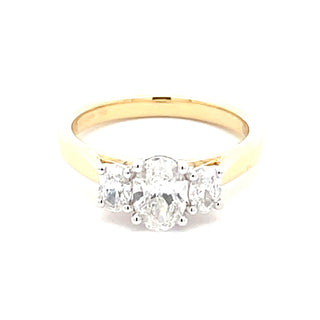 Expertly crafted in 18ct yellow gold, this 3 stone ring features a stunning 0.70ct oval shaped diamond set in a platinum 4 claw setting. With smaller oval diamonds on each side, the total carat weight comes to 1.06cts. Versatile and wedding band friendly, this ring is a timeless and elegant choice.