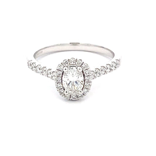 This elegant and classic oval shaped diamond halo style ring is an expertly crafted piece made with a 0.40ct oval shaped diamond set in a platinum 4 claw setting, surrounded by a halo of round brilliant cut diamonds with diamond set shoulders for a total of 0.78cts. The ring is designed to perfectly pair with a wedding band of your choice, making it an ideal choice for a special occasion.