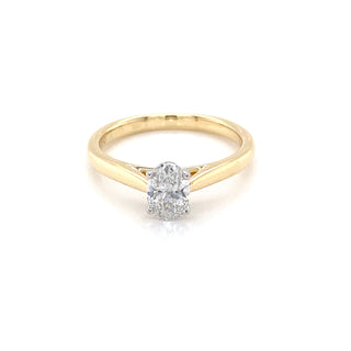 This oval shaped diamond solitaire ring features a stunning 0.61ct oval shaped diamond set in a 4-claw platinum setting. Made with 18ct yellow gold, it is not only elegant but also strong and durable. Its sleek design makes it perfect for everyday wear and is wedding band friendly. Elevate your style with this timeless piece.