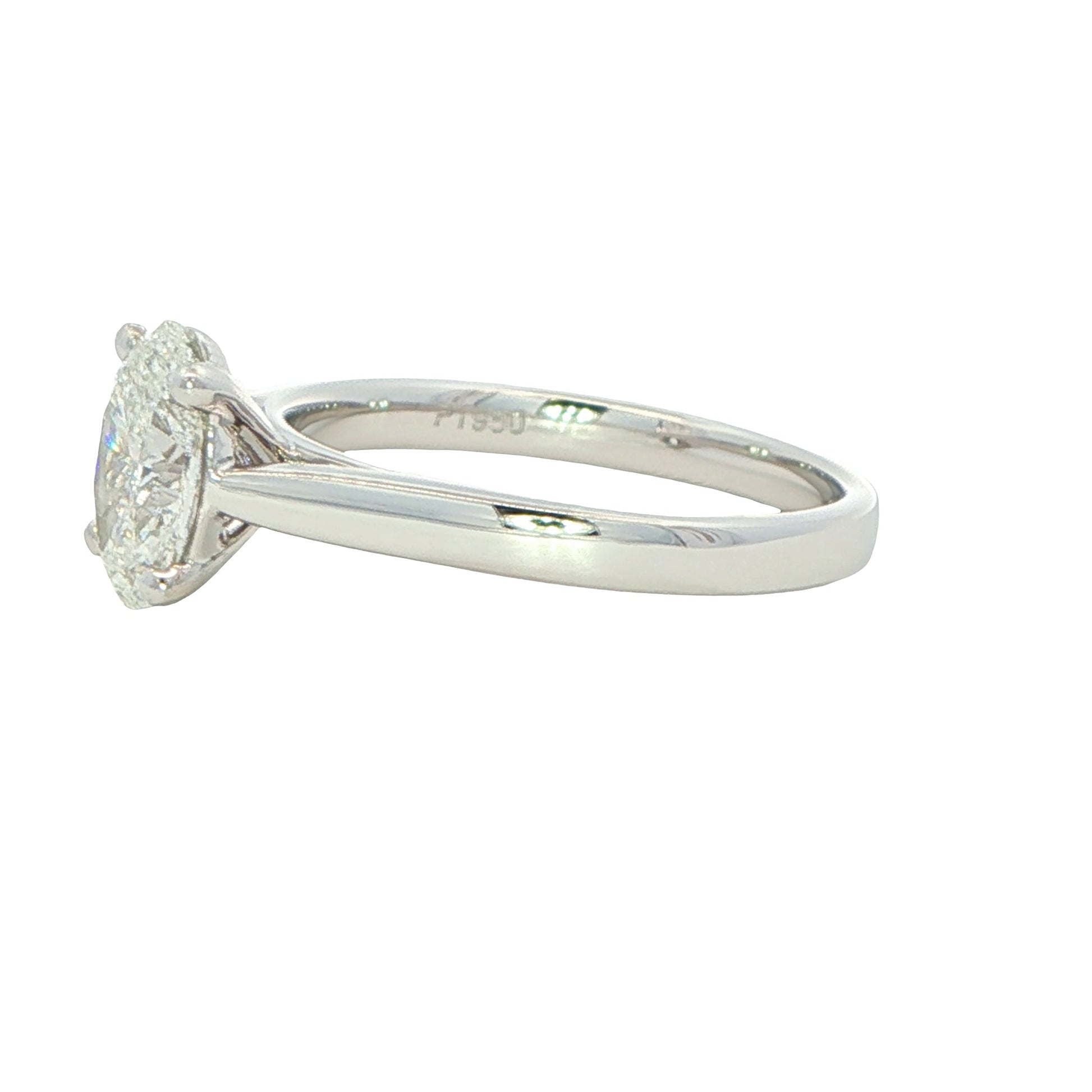 This elegant solitaire showcases a stunning 1.20-carat oval-cut diamond, renowned for its elongated brilliance and sophisticated presence. Securely held in a refined four-claw platinum setting, the design emphasises the stone's natural beauty whilst offering exceptional durability. The timeless solitaire style pairs seamlessly with wedding bands, making it an ideal choice for those seeking versatility in their bridal jewellery.