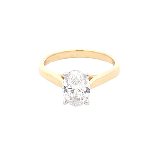This elegant 18ct yellow gold ring features a stunning 1.20ct oval shaped diamond set in a durable 4 claw platinum setting. Its solitaire design makes it perfect for everyday wear and is wedding band friendly. Elevate any outfit with this timeless and sophisticated piece.