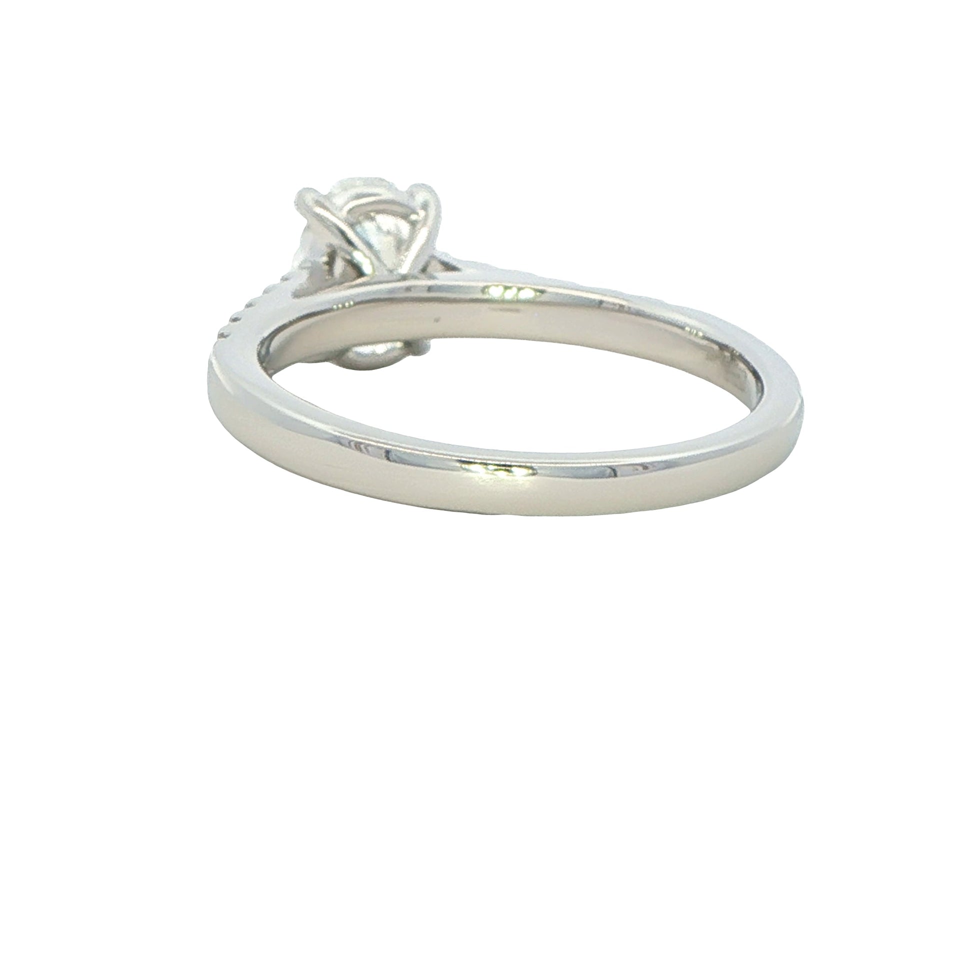 A timeless classic, this 1.25ct Oval Shaped Diamond Solitaire With Diamond Set Shoulders is set in four claw platinum setting for maximum sparkle. With 1.00ct oval diamond at the centre and round brilliant cut diamond shoulders 0.25cts in total, this ring is an unmistakable symbol of eternal love. Wedding band friendly, it completes your special day.