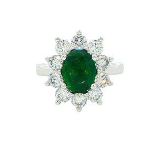 Elevate your jewellery collection with this captivating platinum ring, where a luminous oval emerald takes centre stage in an elegant four-claw setting. Ten round brilliant-cut diamonds encircle the emerald in a stunning cluster arrangement, amplifying its natural beauty and creating an undeniable presence on your finger. The cool brilliance of platinum perfectly frames the emerald's rich, mesmerising green, whilst the surrounding diamonds catch light from every angle, ensuring this ring commands attention wherever you go. Whether celebrating a milestone or treating yourself to something truly special, this sophisticated design delivers timeless appeal and enduring value. A ring that speaks volumes about your refined taste and appreciation for exceptional craftsmanship.