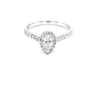This exquisite engagement ring features a pear-shaped diamond as its centrepiece, elegantly surrounded by a halo of round brilliant cut diamonds that amplify its sparkle and presence. The shoulders are adorned with additional diamond settings, creating a seamless flow of brilliance across the hand. Crafted in platinum, this precious metal provides exceptional durability and a lustrous white finish that complements diamonds perfectly. The sophisticated design accommodates a matching wedding band, which sits flush against the ring for a refined, unified appearance. A timeless choice for those seeking understated luxury and enduring elegance.