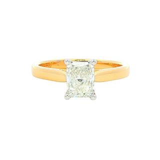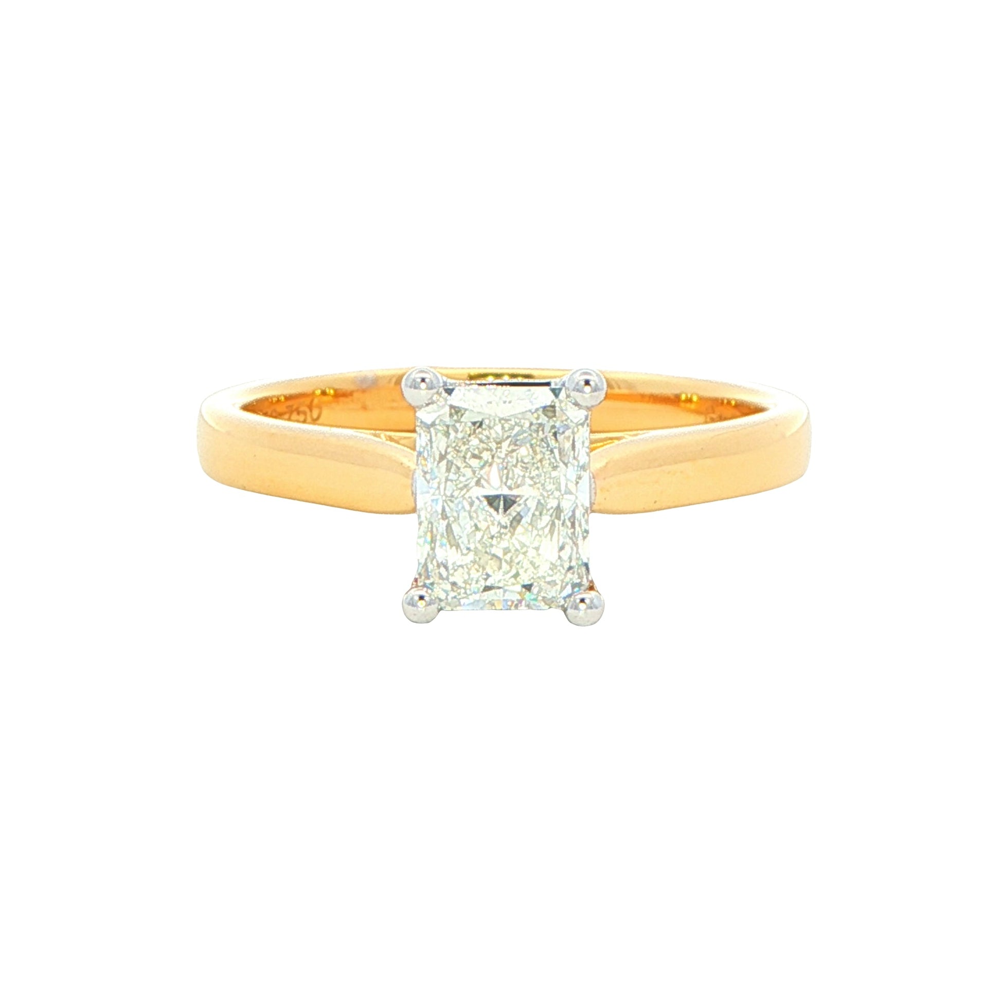 This Radiant Cut Diamond Solitaire Ring is crafted from 18ct yellow gold and features a 1.00ct radiant cut diamond set in a 4 claw platinum setting. It is designed to complement a wide range of wedding bands, making it an ideal choice for those looking for the perfect engagement ring.