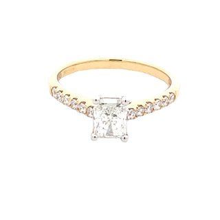 Elevate your look with our stunning Radiant Cut Diamond Solitaire Ring. Crafted in 18ct yellow gold, it features a 0.73ct radiant cut diamond set in a 4 claw platinum setting for maximum sparkle. With round brilliant cut diamond set shoulders totalling 0.98cts, this ring is wedding band friendly for the perfect union.