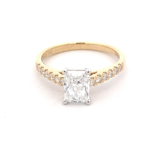 Expertly crafted with 18ct yellow gold, this radiant cut diamond solitaire ring showcases a stunning 1.01ct diamond in a 4 claw platinum setting. With sparkling round brilliant cut diamonds set on the shoulders, this ring is wedding band friendly and radiates elegance.