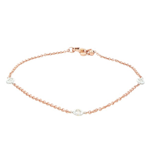 This exquisite yard of diamond bracelet combines the warmth of 9ct rose gold with the timeless elegance of white gold. Three round brilliant cut diamonds are expertly set in a secure rub-over setting, allowing maximum light to dance through each stone. The contrasting metal tones create a sophisticated aesthetic that transitions seamlessly from day to evening wear. A refined piece that celebrates understated luxury and exceptional craftsmanship.