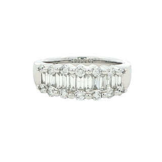 This platinum eternity ring showcases timeless elegance through its expertly balanced design. A striking central row of baguette-cut diamonds commands attention, their geometric precision creating a sophisticated linear statement. Flanking this focal point on either side, rows of round brilliant-cut diamonds add radiant sparkle and visual dimension. The combination of cuts demonstrates refined craftsmanship, with the baguettes' clean lines complemented by the classic brilliance of round stones. Totalling 1.00 carat, this piece offers substantial presence whilst maintaining graceful proportions.