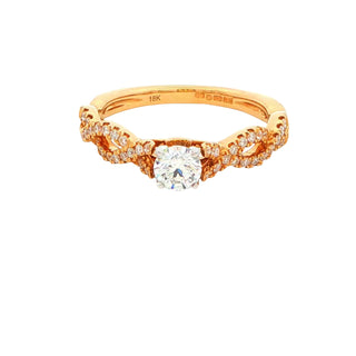This exquisite ring features a 0.55-carats of round brilliant cut diamonds, expertly set in a secure 18ct yellow gold band with a contrasting 4-claw white gold setting. The figure-of-eight style shoulders are adorned with twisted diamond accents, adding a sophisticated sparkle and enhancing the ring’s elegant design. Perfect for those seeking a timeless yet distinctive piece.