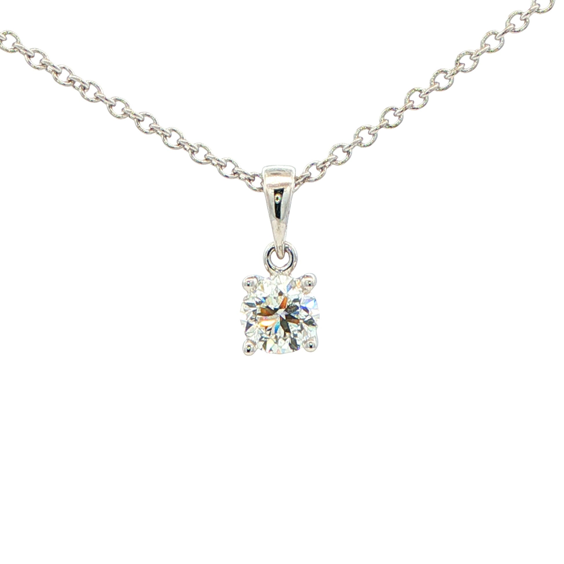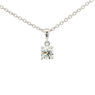 This elegant solitaire pendant features a stunning 0.50 carat round brilliant cut diamond, expertly set in a secure four-claw mounting crafted from 18ct white gold. The timeless design showcases the diamond's exceptional sparkle and clarity, while the classic solitaire setting allows maximum light to enhance its brilliance. Suspended on an adjustable white gold chain, this versatile piece transitions effortlessly from everyday wear to special occasions. A refined investment in enduring elegance.