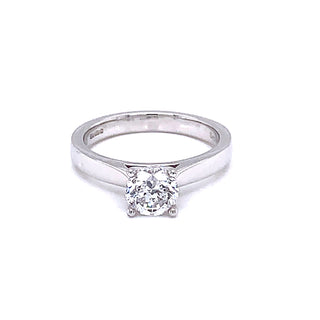 A stunning platinum solitaire featuring a 0.91-carat round brilliant cut diamond in F colour with SI1 clarity. The elegant four-claw setting showcases the diamond's exceptional sparkle whilst maintaining a refined, timeless aesthetic. Expertly designed to sit seamlessly alongside wedding bands, this versatile piece offers the perfect balance of sophistication and practicality. An investment in enduring beauty and quality craftsmanship.