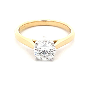 This exquisite Round Brilliant Cut Diamond Solitaire Ring features a 1.20ct diamond set in a 4 claw platinum setting accompanied by an 18ct yellow gold band. Perfectly crafted for any finger, it is also wedding band friendly. Radiate elegance and sophistication with this timeless piece.