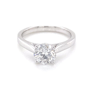 Expertly crafted and designed, our Round Brilliant Cut Diamond Solitaire Ring features a stunning 1.30ct diamond set in a secure 4 claw platinum setting. With its elegant design, this ring is perfect for any occasion and is also wedding band friendly. Elevate your style with this timeless piece.
