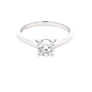 This stunning Round Brilliant Cut Diamond Solitaire Ring features an exquisite 0.80ct round brilliant cut diamond set in a classic 4-claw setting. Crafted from platinum for a durable, luxurious finish, and wedding band friendly for easy stacking. An exquisite statement piece.