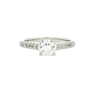 A stunning platinum solitaire showcasing a 0.70ct round brilliant cut diamond in a secure four-claw setting. Diamond-set shoulders add refined sparkle, bringing the total carat weight to 0.95cts. This expertly crafted design complements wedding bands seamlessly, making it an ideal choice for those seeking timeless elegance with contemporary sophistication.