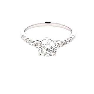 Expertly crafted with a 1.00ct round brilliant cut diamond in a 4 claw setting, this platinum solitaire ring boasts 1.25cts in total with diamond set shoulders. Its timeless design is also wedding band friendly. Elevate your special moment with this stunning piece.