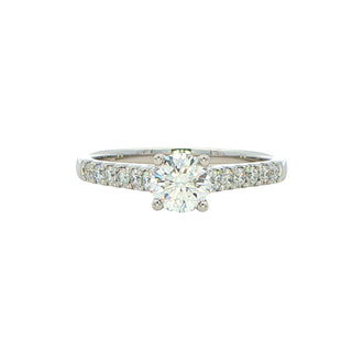 This exquisite platinum solitaire showcases a stunning 0.50ct round brilliant cut diamond held securely in an elegant four-claw setting. The design is elevated by matching round brilliant cut diamond shoulders totalling 0.75cts, creating a harmonious graduated effect that frames the centre stone beautifully. Crafted with meticulous attention to detail, this ring combines timeless sophistication with practical versatility—the refined profile sits comfortably alongside wedding bands, making it an ideal choice for those seeking a coordinated bridal set.