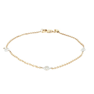 This elegant bracelet combines the warmth of 9ct yellow gold with the brilliance of three round brilliant cut diamonds, each secured in a sophisticated white gold rub-over setting. The "yard of diamond" design creates a refined, understated aesthetic that works beautifully for both everyday wear and special occasions. The contrast between the yellow and white gold adds contemporary appeal, whilst the secure rub-over settings protect your diamonds. A timeless piece that balances classic craftsmanship with modern design sensibilities.